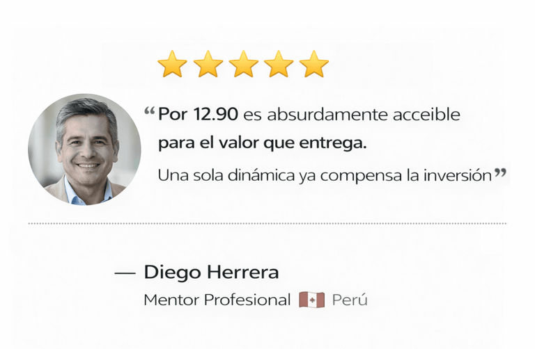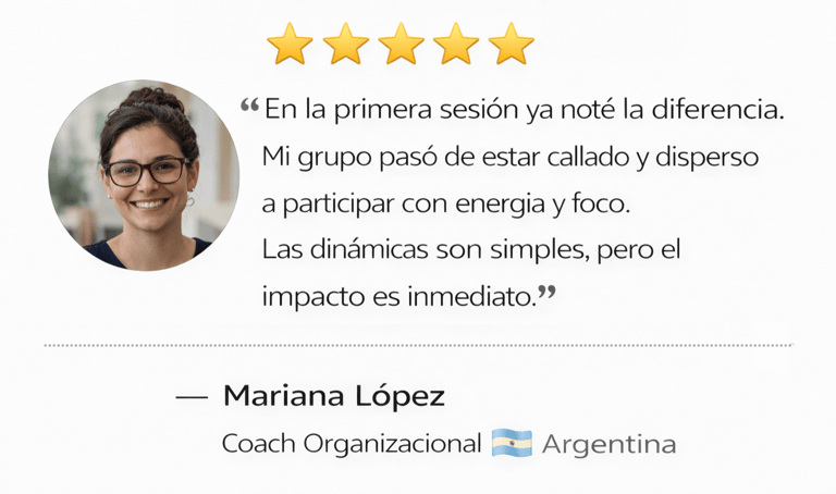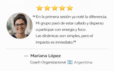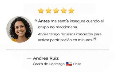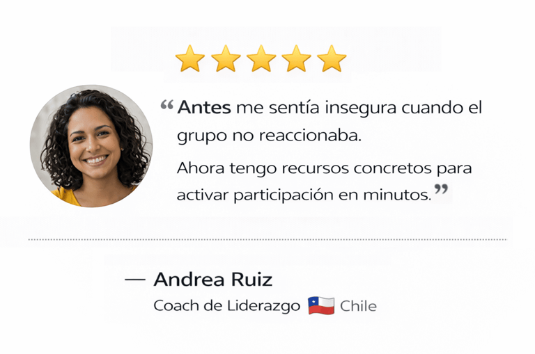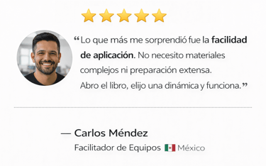 Recibirás actividades diseñadas para crear una conexión genuina entre los participantes, facilitar un ambiente de confianza y generar apertura desde los primeros minutos de la sesión.