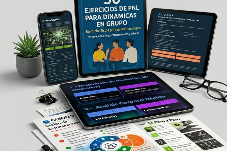 Instrucciones paso a paso para conducir sesiones sobre temas clave como: autoconfianza, manejo emocional, comunicación, creencias limitantes y logro de metas. Cada guion combina técnicas del manual principal para brindar estructura, seguridad e impacto inmediato.